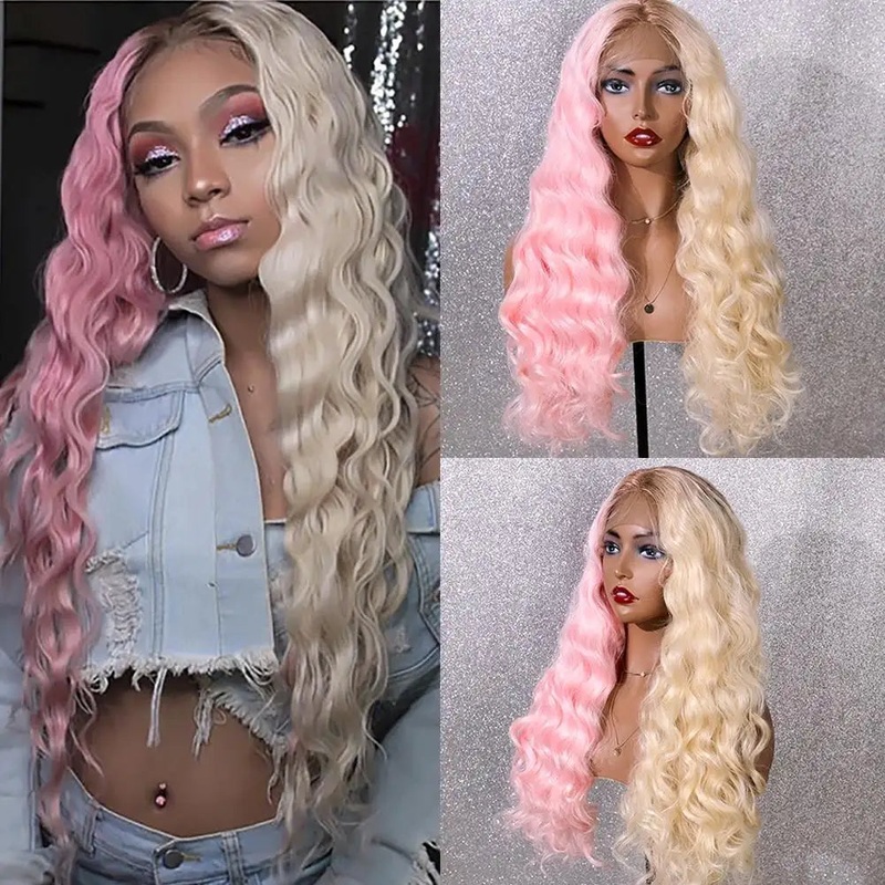 Wavy Half Pink Half Blonde Synthetic Lace Front Wig or Full Pink Wig