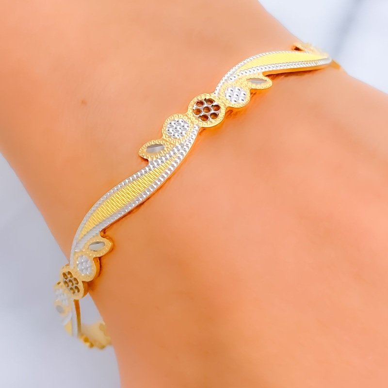 The Wavy Two-Tone Floral 22k Gold Bangle, weighing 15.2 grams, is a splendid example of exquisite design and craftsmanship. Made from 22k gold, it features a yellow gold finish, highlighting the elegant two-tone floral pattern. The bangle, sized at 2.6 wit