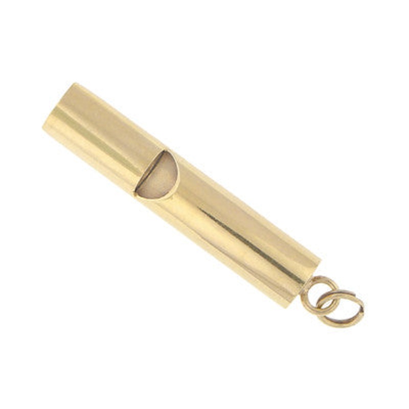 This vintage estate whistle pendant is a full size whistle that actually works! This large whistle charm in 14K goldis a sure-fire attention getter, and measures 3/8 inch wide and 2 inches long including the large 14K yellow gold split ring bail forwear on a favorite neckchain.