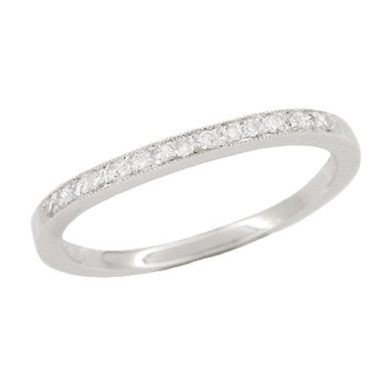 This white sapphire contoured ring is crafted by our jewelers to coordinate with our curved engagement ring styles only. Orders for this ring without a previous or current order for a companion engagement ring from us will not be honored.