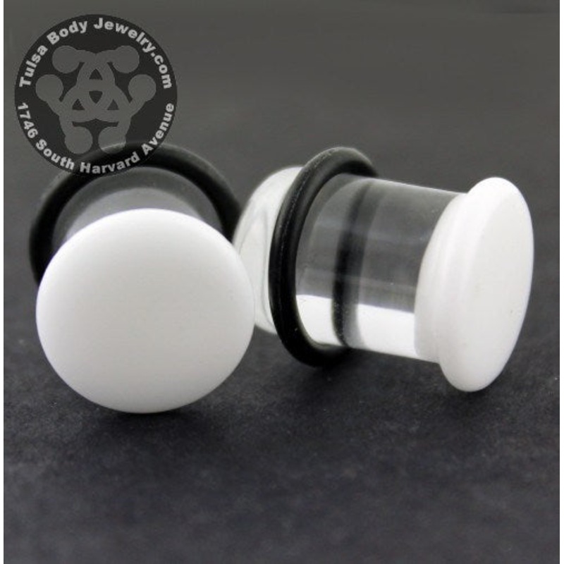These single flare white color front plugs are made from hand blown borosilicate glass by glasswear studios. They have approximately 3/8" wearable area between the flare and o-ring. Two o-rings are included. Choose your size below.