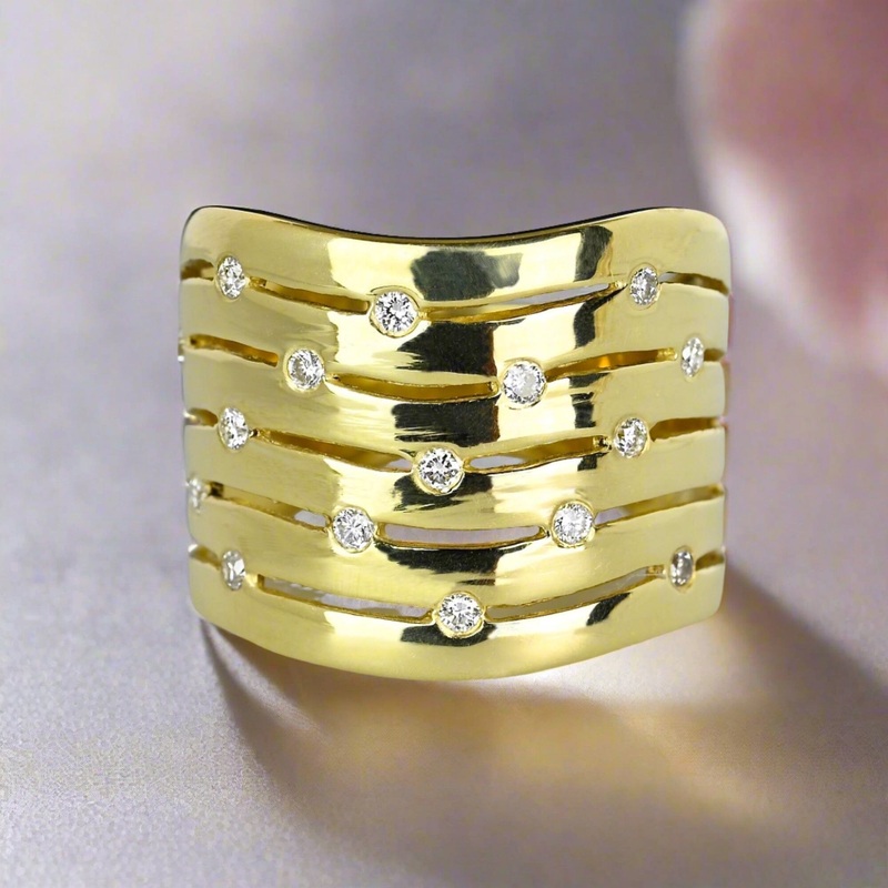 Wide 14K Gold Chevron Wave Diamond Ring Band