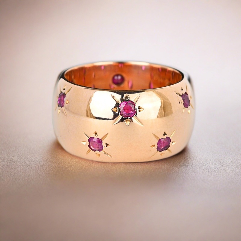 Exquisitely forged from a luxurious 14K rose gold, this vintage eternity band showcases an array of rich ruby gemstones, each nestled inside a glittering star-shaped setting. An endlessly versatile piece, this 10.25mm wide ruby ring can be worn alone as a