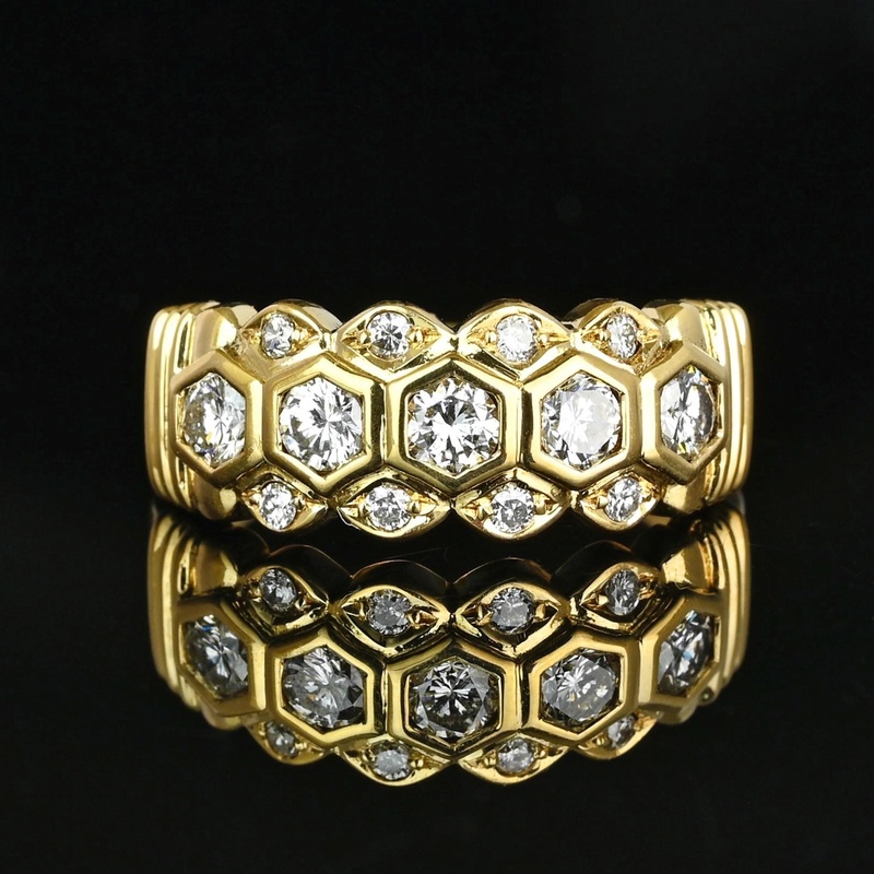 Brilliant diamonds shine on this fabulous retro 18K gold ring band. Three tiers of circular diamonds, totaling .60 carats, glide along the front of the wide band with the middle layer forming a hexagon and the top and bottom layers creating a scalloped edg