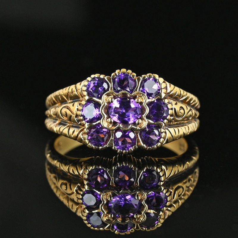 Wide Gold Engraved Band Floral Cluster Amethyst Ring