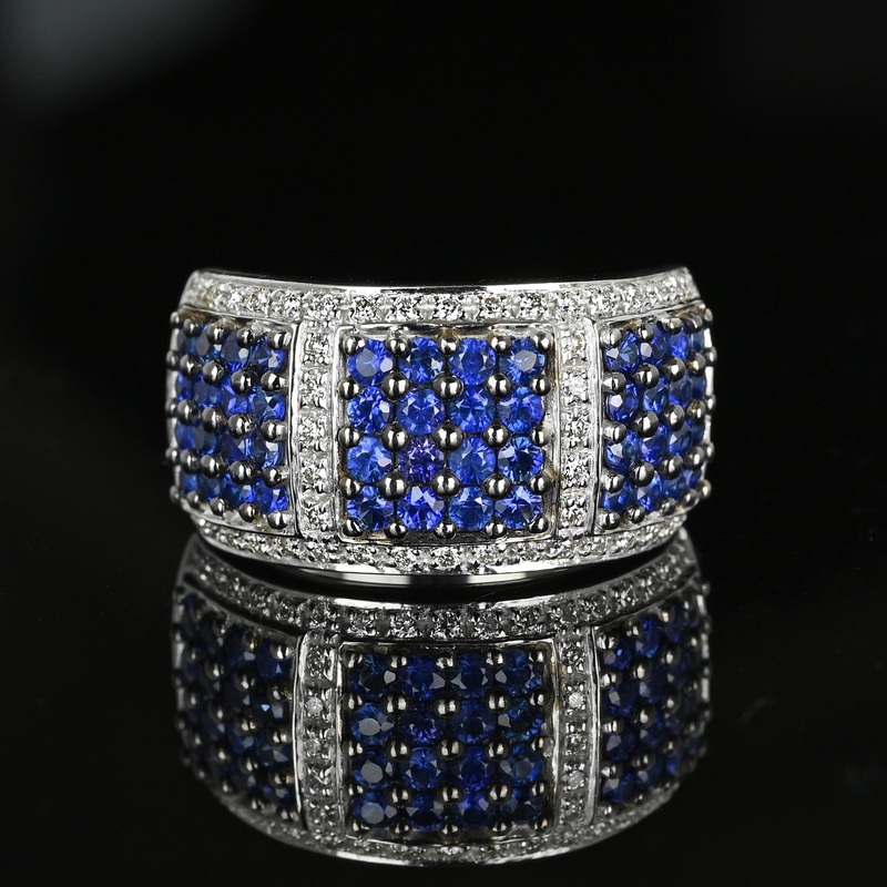 This LeVian ring is a true stunner – expertly crafted in solid 14K white gold and adorned with three panels having four rows of pave set natural blue sapphires surrounded by sparkling white diamonds. It’s a must-have for any jewelry lover and comes with full LeVian hallmarks. Get ready to make a statement with this berrylicious sapphire and diamond beauty!