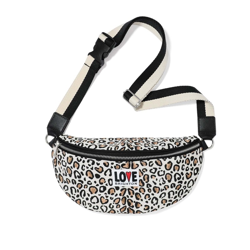 Our classic belt bag by designer Britney Drumheller has its own love patch adhered to is leopard print that she hand drew. A black zipper and a two- tone black & tonal webbing matches the ground of the leopard print. It's a basic leopard print however the