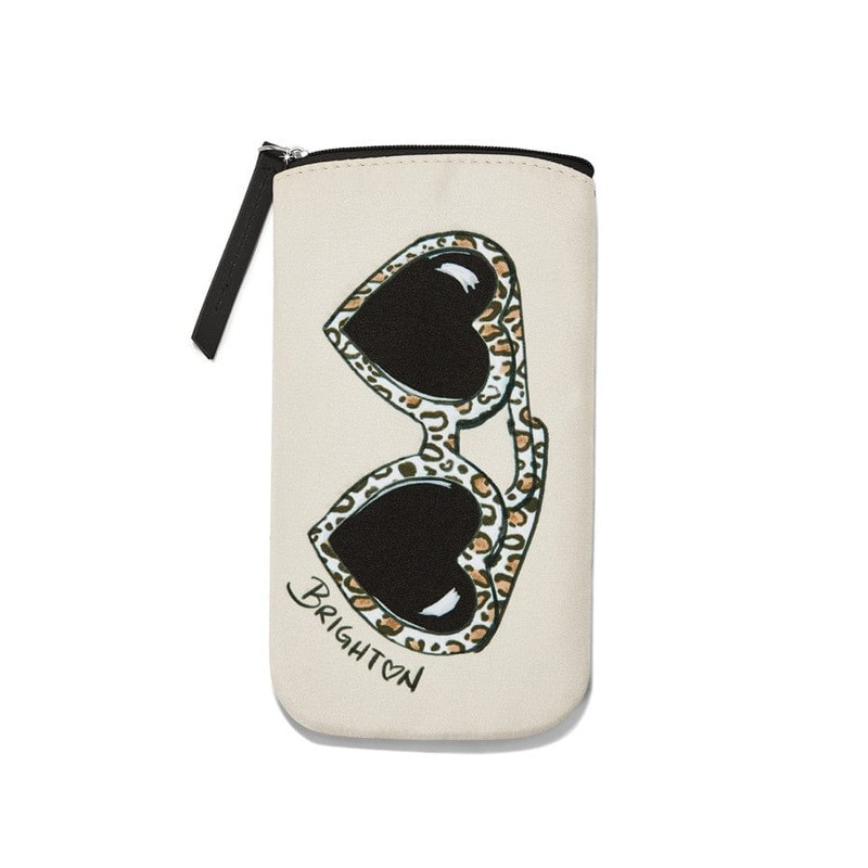 We all love leopard and its time to step into our wild side in a way. Designer Britney Drumheller painted the leopard motifs on her iPad, and some of the leopard spots turned into heart shapes. She tied it back to heart shaped glasses so you can look at life with a bit of love and playfulness. Its a new sunglass case shape for us as we added an extra pocket. The inside is a black and white painterly stripe lining. The case is finished with a faux leather zipper pull.