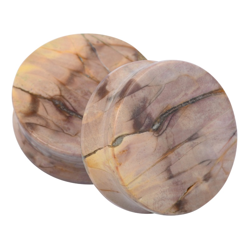 These double flare plugs are carved from Willow Creek Jasper with a flat face on both sides and wearable area of 3/8" between flares. Each pair is unique and will differ from the product photo, but we can always send a pic of yours before shipping! Choose