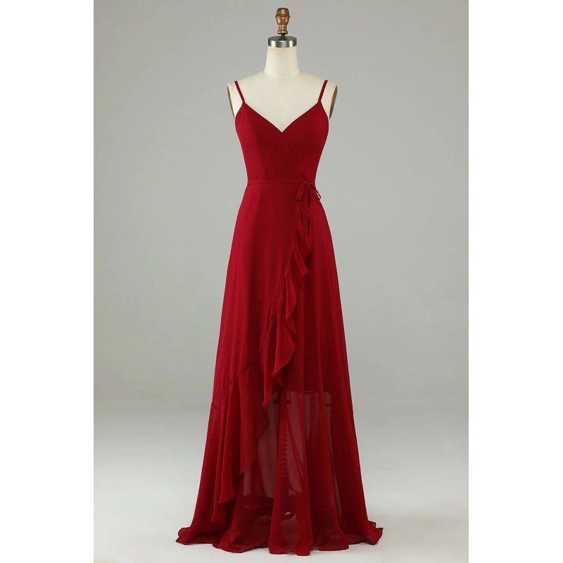 Wine red thin shoulder strap with ruffle edge chiffon long bridesmaid dress