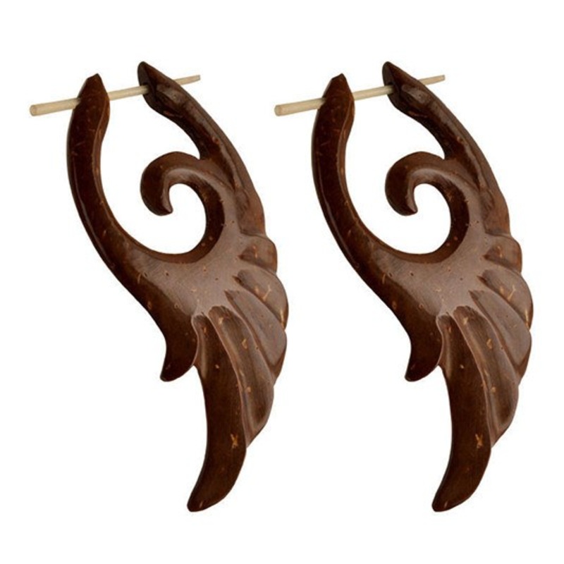These handcarved wing stirrup earrings are made from coco wood. The pins that secure these earrings will measure between 16g and 14g in the wearable area.