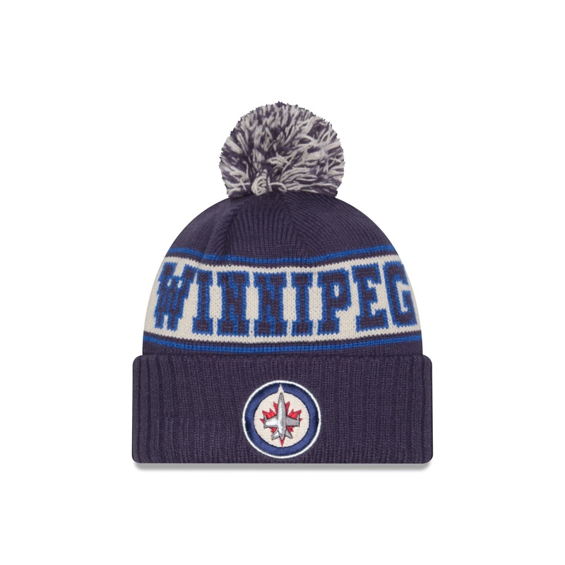The Winnipeg Jets Retro Pom Knit Hat features an embroidered Jets logo at the front cuff with a team wordmark at the crown and a one-time removable pom.