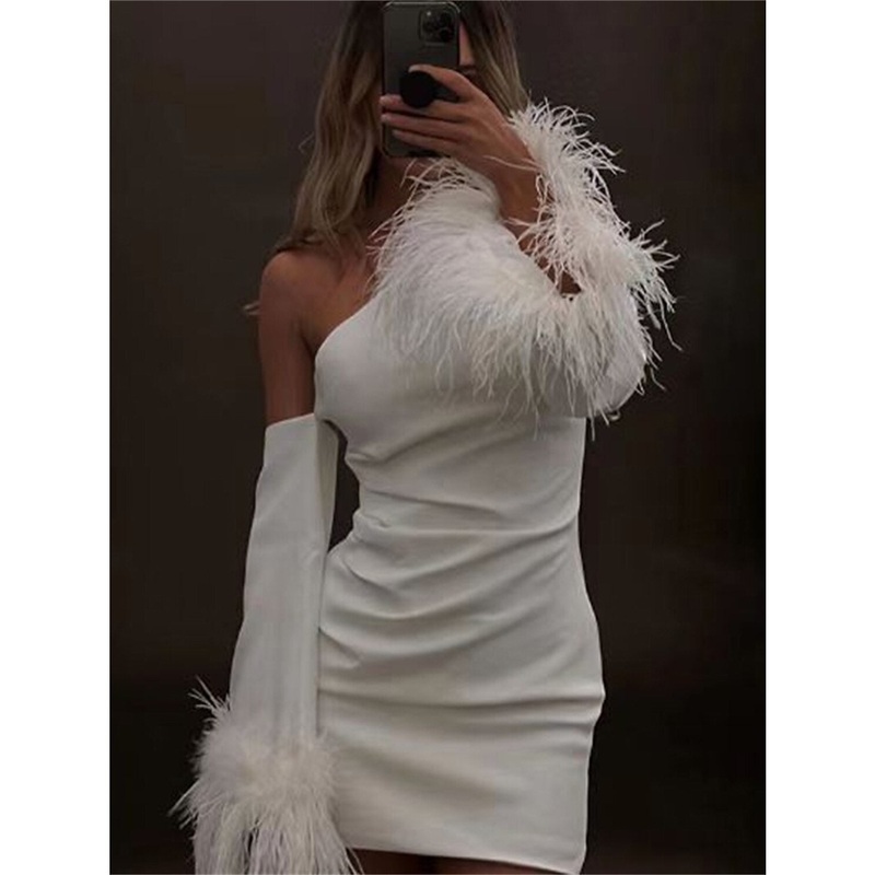 Women’s Party Dress Feather Dress Homecoming Dress Mini Dress Black White Long Sleeve Pure Color Feather Fall Winter Autumn One Shoulder Fashion Winter Dress Wedding Guest Vacation