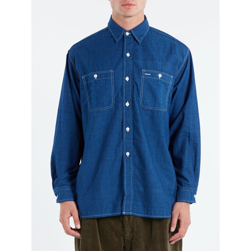 BEAMS PLUS chambray work shirt based on the work shirts of American store brands from the 1950s. Made using an old-fashioned power loom called a shuttle loom, it features a fluffy and uneven texture and the natural nap of cotton.Point collarFront button cl