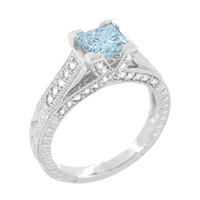 Absolutely dazzling, this amazing princess cut antique style aquamarine and diamond engagement ring is meticulously crafted in luxurious 18K white gold, set with a beautiful princess cut natural aquamarine ( March Birthstone ) of 1.23 carat, and adorned with a wealth of antique-inspired detail and engraved on the 3 outward facing sides of the band with a wheat pattern, framed with millgrain edging on the sides.