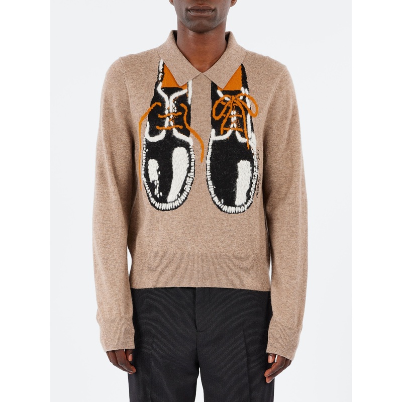 Polo collar knit crafted from carefully selected high-quality yak yarn, featuring a graphic intarsia seasonal design. Finished with ribbed cuffs and hem, and an embroidered logo on the front. Cut to a fitted style and waist length.Polo collarKnitted season