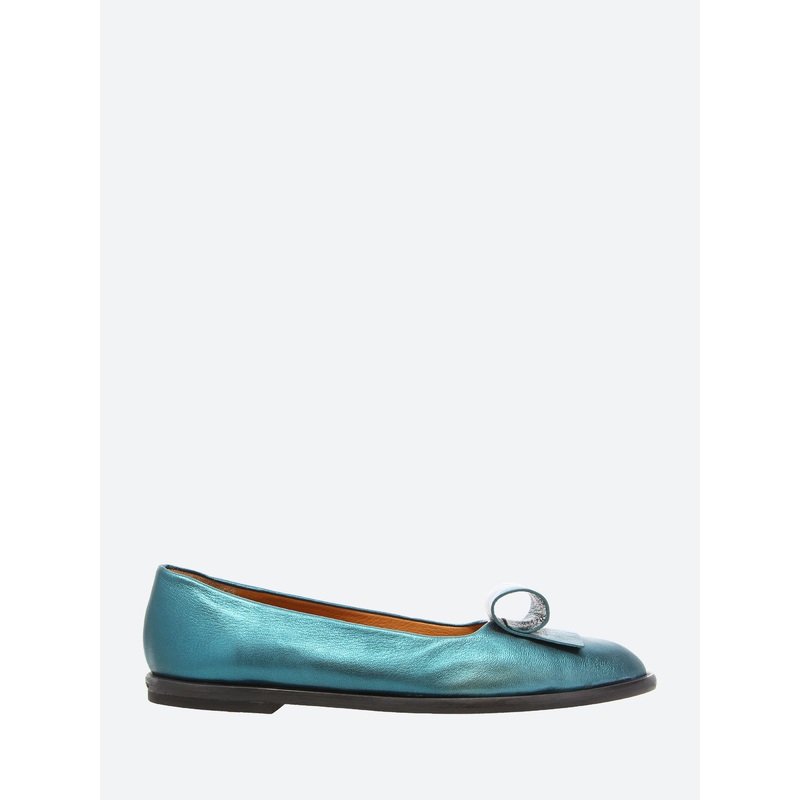 A statement, metallic leather is paired with a chic, flexible sole morphing this formal loafer silhouette into one supremely fit for an on-the-go lifestyle. The Yale flat is adorned at the toe with an architectural loop and a minimalist, one-piece kiltie.B