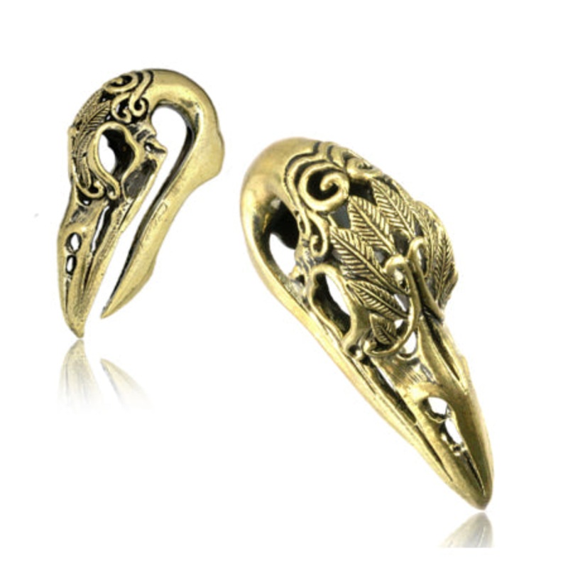 These carved crow skull hangers are cast from yellow brass. They fit stretched ear lobes sized2 gauge or larger. Choose your size below.