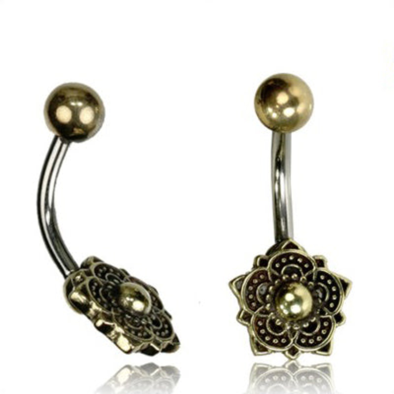 The 14 gauge flowerbelly ring ismade fromyellow brass and 316L stainless steel with external threading. The 5mm top ball is removable and the bottom is fixed.