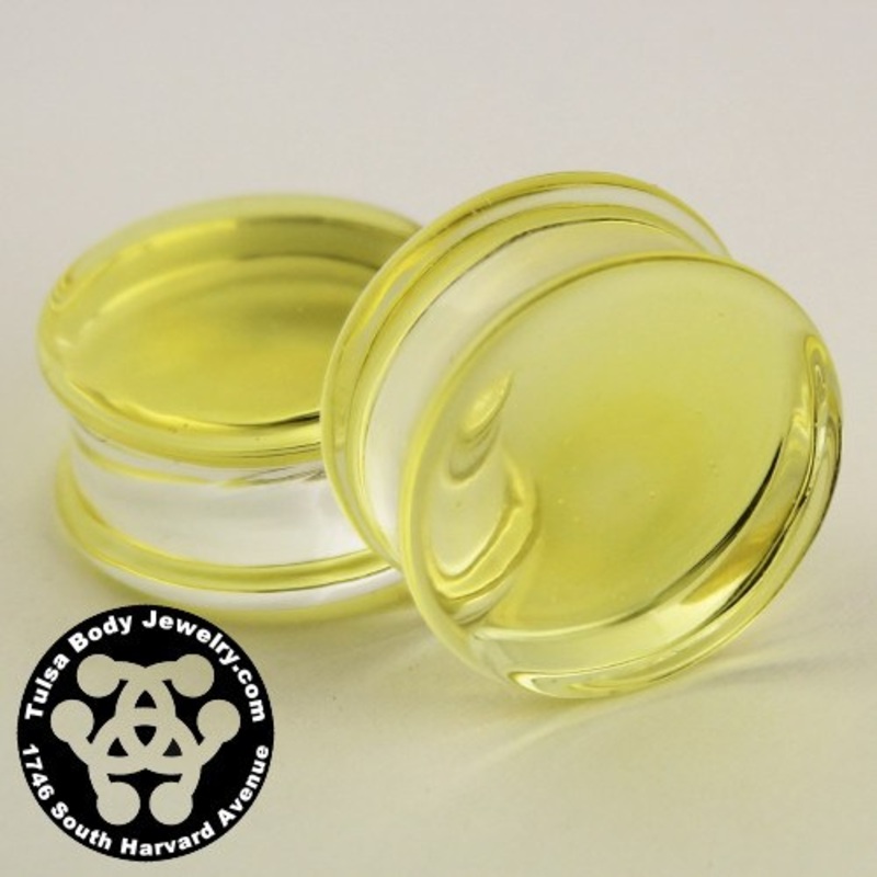 These double flare yellowcolor front plugs aremade from hand blown borosilicate glass by glasswear studios. They have a wearable area of approximately 3/8" between flares. Choose your size below.