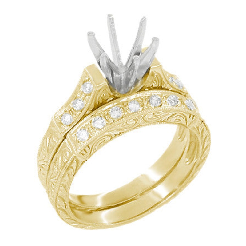 Yellow Gold Art Deco Engraved Scrolls Round 1 Carat Diamond Engagement Ring Setting and Matching Wedding Ring – 14K or 18K