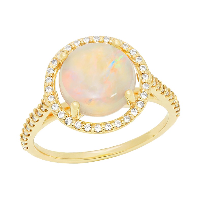 Yellow Gold Cabochon Round Opal Ring with Halo Side Diamonds – 2.60 Carat Opal – Grisey’s Ring