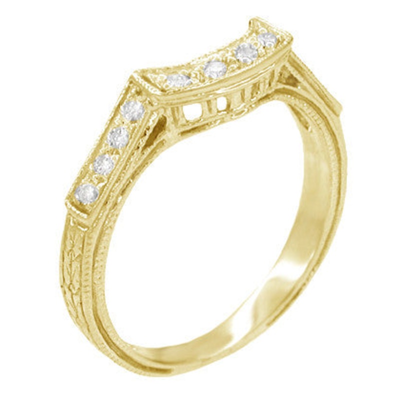 Yellow Gold Curved Bridge Art Deco Engraved Diamond Filigree Wedding Ring – 18K or 14K Gold