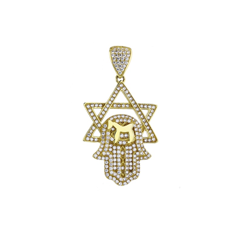 Yellow Gold CZ Micropave Hamsa with Star David Pendant (14K)