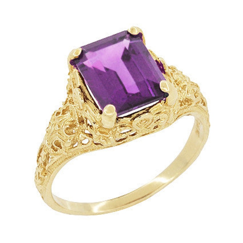 Yellow Gold Edwardian Filigree Emerald Cut Amethyst Engagement Ring
