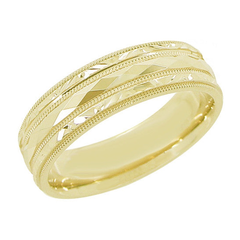 Artisan crafted from a classic retro Mid-Century design, this 6mm wide solid yellow gold carved wedding ring for couples features a vintage high polish light-scattering diamond kaleidoscope pattern at the center of the ring, framed by beaded millgrain edging. An engraved circle and chevron pattern decorates the border edges of the ring, with more millgrain beaded edging on the outside of the band as a finishing touch.