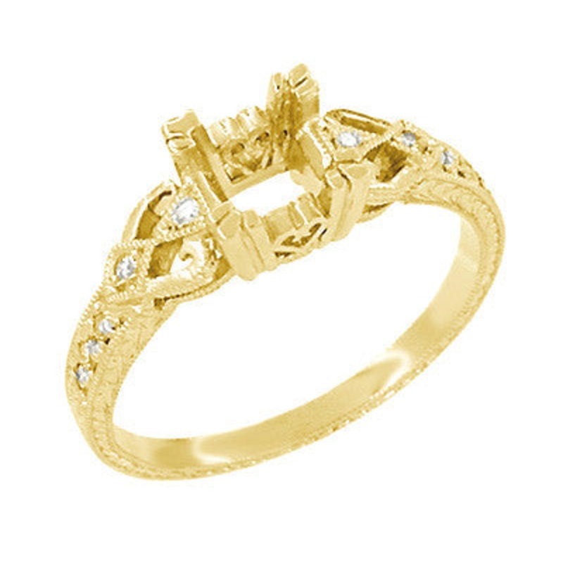 This unforgettable vintage style yellow gold engagement ring mounting is crafted to order in your choice of 14K or 18K yellow gold.