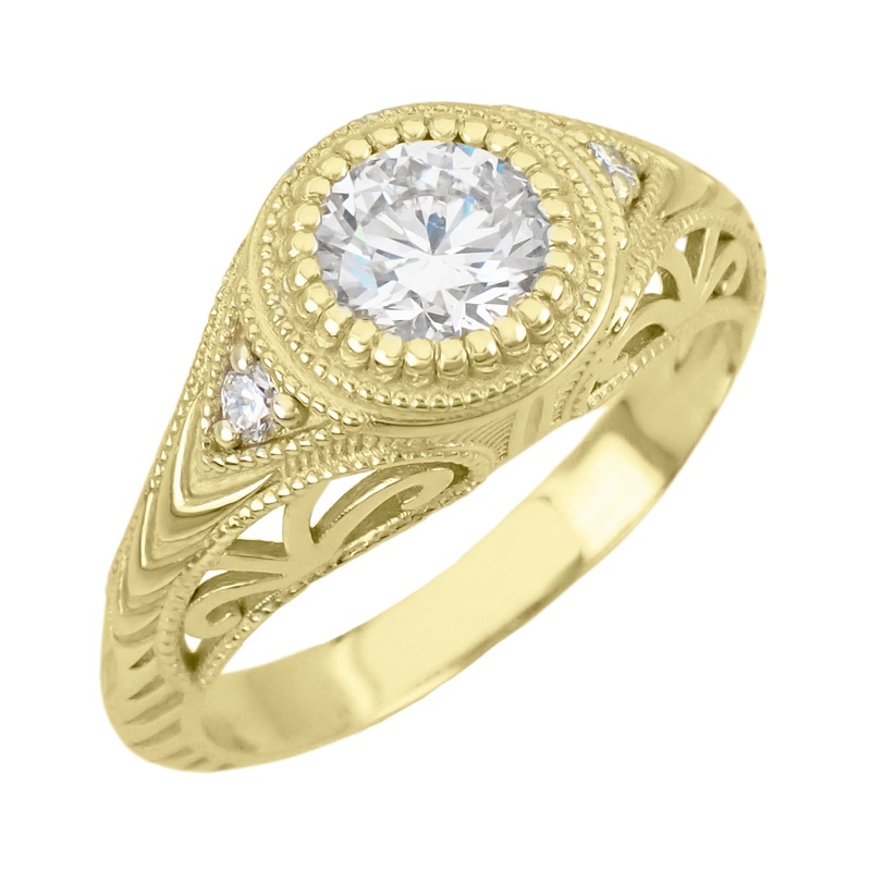 Yellow Gold Filigree Low Dome Art Deco 3/4 Carat Diamond Engagement Ring – 14K or 18K