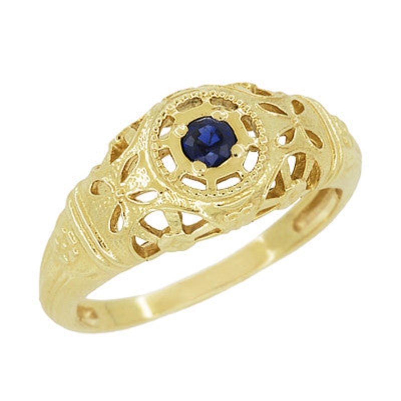 Yellow Gold Low Dome Floral Filigree Art Deco Blue Sapphire Ring