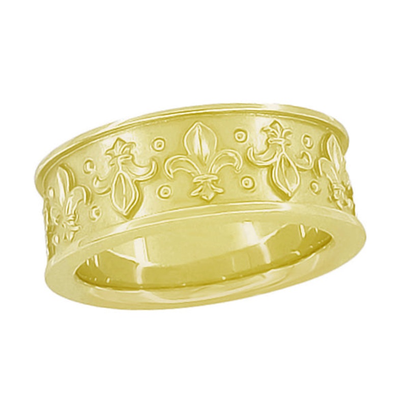 This gorgeous solid yellow gold vintage style wide fleur-de-lys wedding ring features an iconic scupltural fleur-de-lis design all the way around the band, with a smooth high polished inside for a lifetime of comfort. Sure to always be noticed, this classi