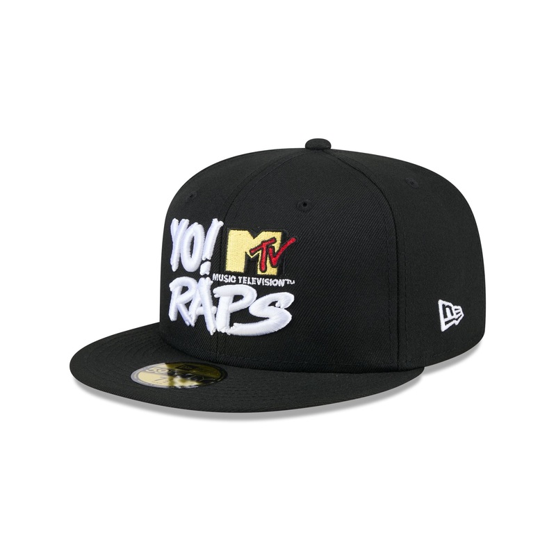 The Yo! MTV Raps Black 59FIFTY Fitted Cap features an embroidered Yo! MTV Raps wordmark at the front panels with a matching YO! wordmark at the rear and a patterned undervisor.