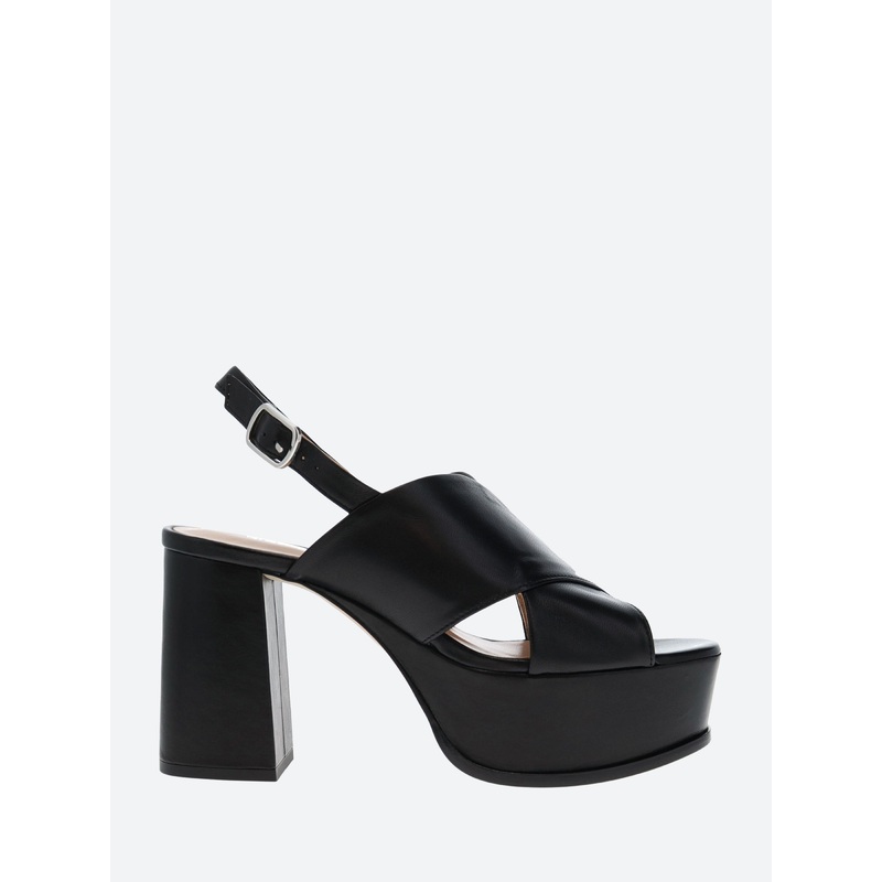gravitypope Zeba slingback sandal with a chunky heel and platform base with retro appeal.Adjustable buckle closureCurved leather strap across the vampSlip-on styleOpen toeMetallic embossed logo at the footbedMeasurements:90mm heelMaterials Upper: leatherLi