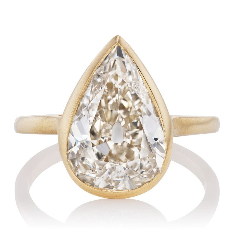 TheZinfandel 4.08 ring is an AB original design made right here in NYC. The ring centers a GIA-certified 4.08-carat pearcut diamond ofK color,SI2 clarity. The stone is bezel-set in an 18kt yellow gold setting. The ring is currently size5.75 and can be resized!